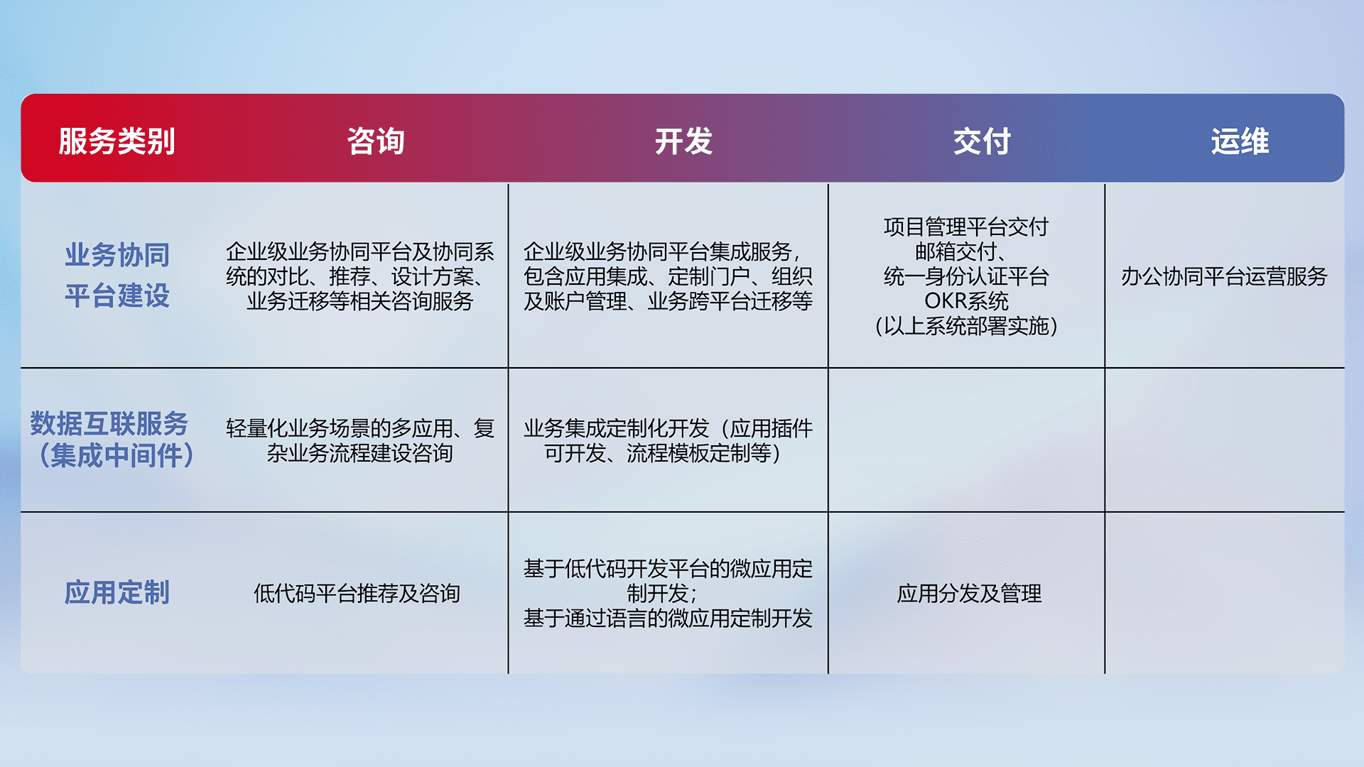 针对钉钉、、、企微、、、IDaas等平台级产品提供产品的规划、、方案、、、、交付、、定制化开发等服务,,,实现如统一协同办公、、、、智能客户服务、、、、混合会议管理、、智能数据查询、、、等业务场景,,,,实现数字化转型。。。。